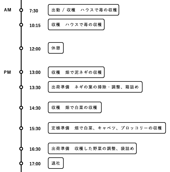- 会社員として農業がしたいと思いましたが「具体的に農業はどんな仕事なのか」「自分はどんな野菜を作りたいのか」よくわかっておらず、どんな会社を選べばよいのか迷っていました。この会社はいくつもの農場があり、多種の野菜を生産、加工、販売しており、また一年間研修生として幾つかの農場で働けるということだったので、農業について広く学べると思い入社したいと思いました。